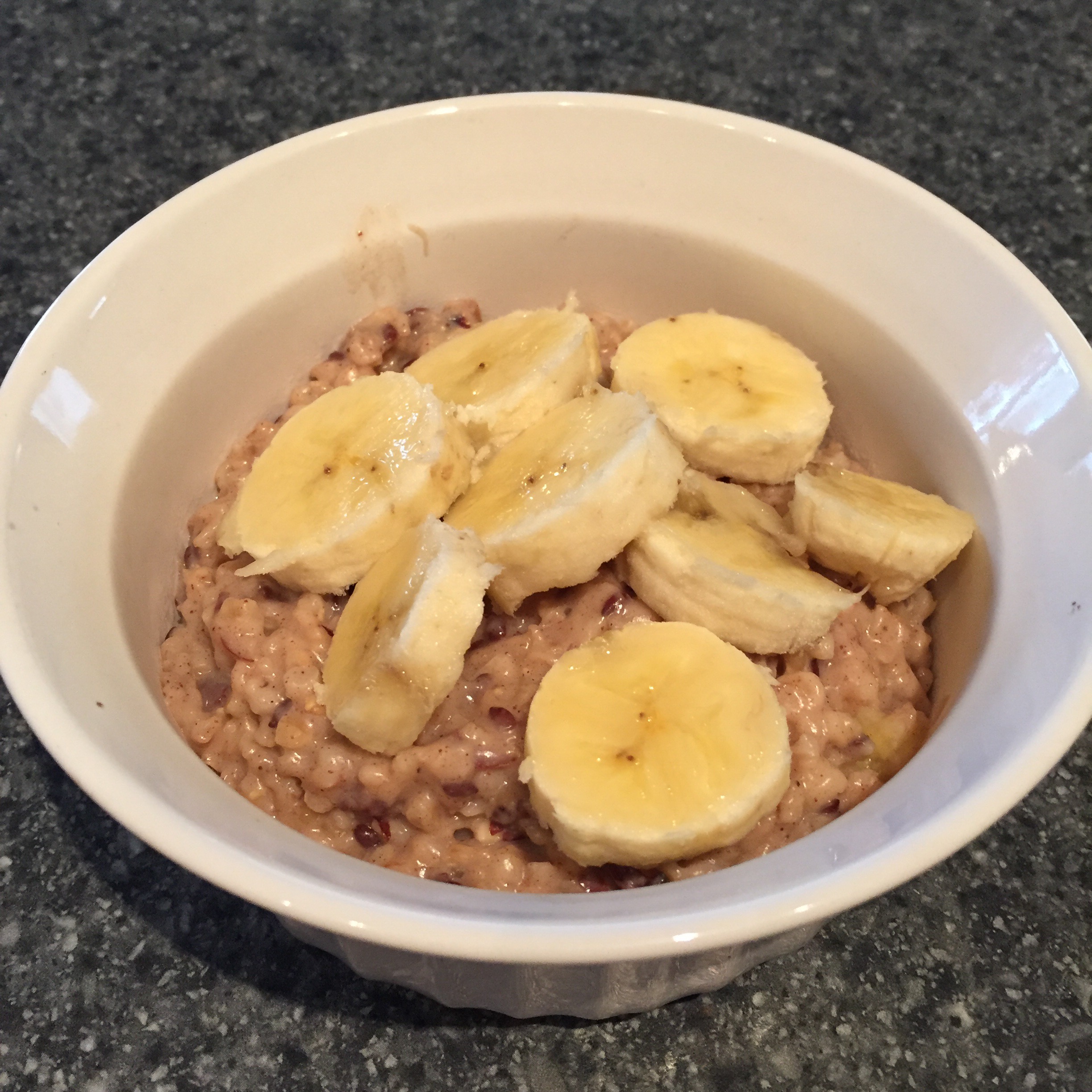 Place crockpot liner in crockpot (I just recently started using these and swear by them now!). Mix all ingredients together and place in crockpot. Cook on low for 4-5 hours. Eat warm and top with banana slices if you would like!