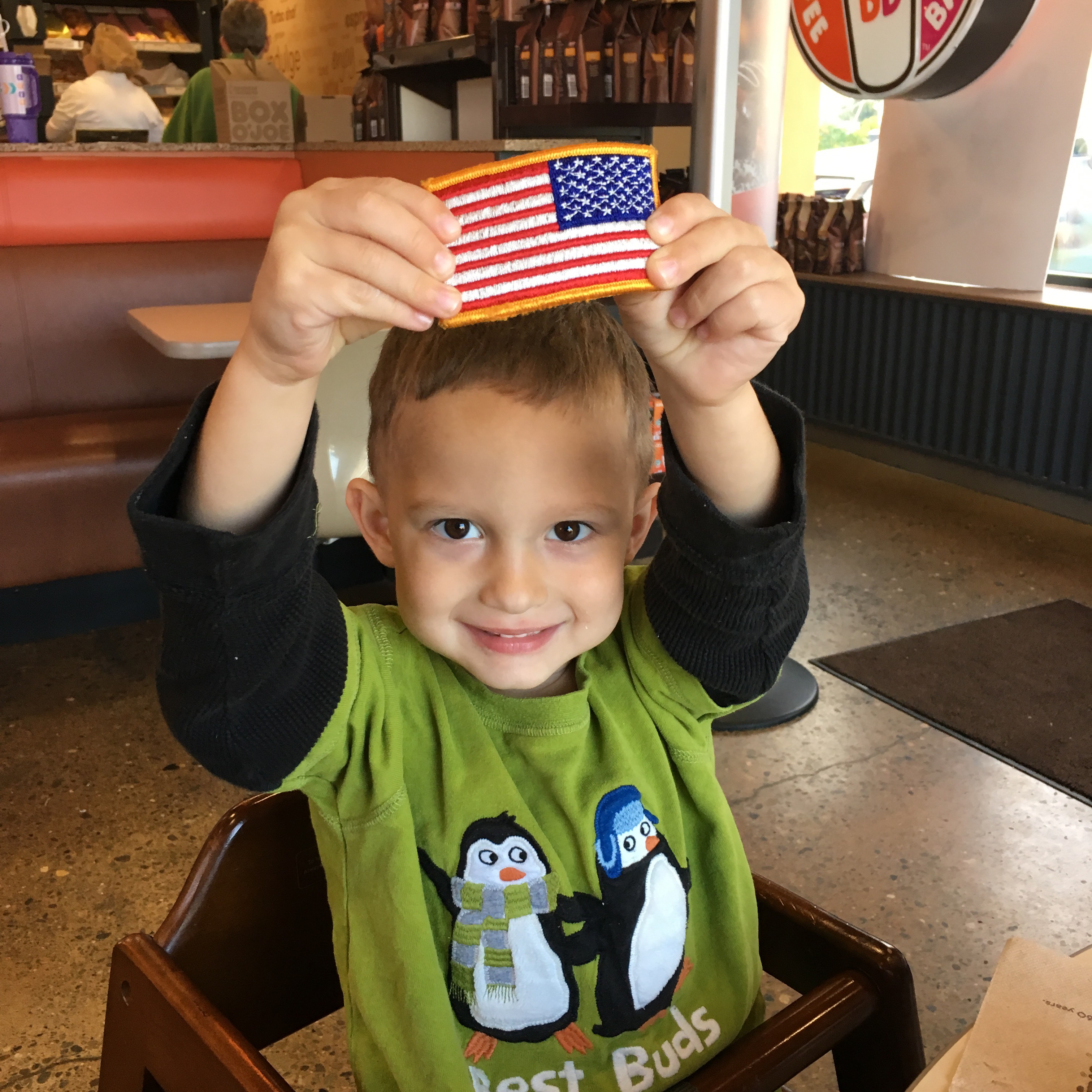 On Friday, I experienced such a wonderful thing with my son. We went to Dunkin Donuts because he had been asking for a donut for 2 days. We ordered and sat down. We started to enjoy our breakfast when a group of about 12 soldiers came in. They all placed their orders and sat down. One sat right behind me and Jordan kept looking at him. He said, “That is that man’s hat.” I replied, “Yes, buddy it is.” He said, “That is the American flag.” I said, “Yes it is.” He said, ” I can’t say hi to him.” I said, “Sure you can buddy. You can always say hi to someone in uniform.” The man must have heard our conversation because Jordan started acting shy and said “hi” very timidly.