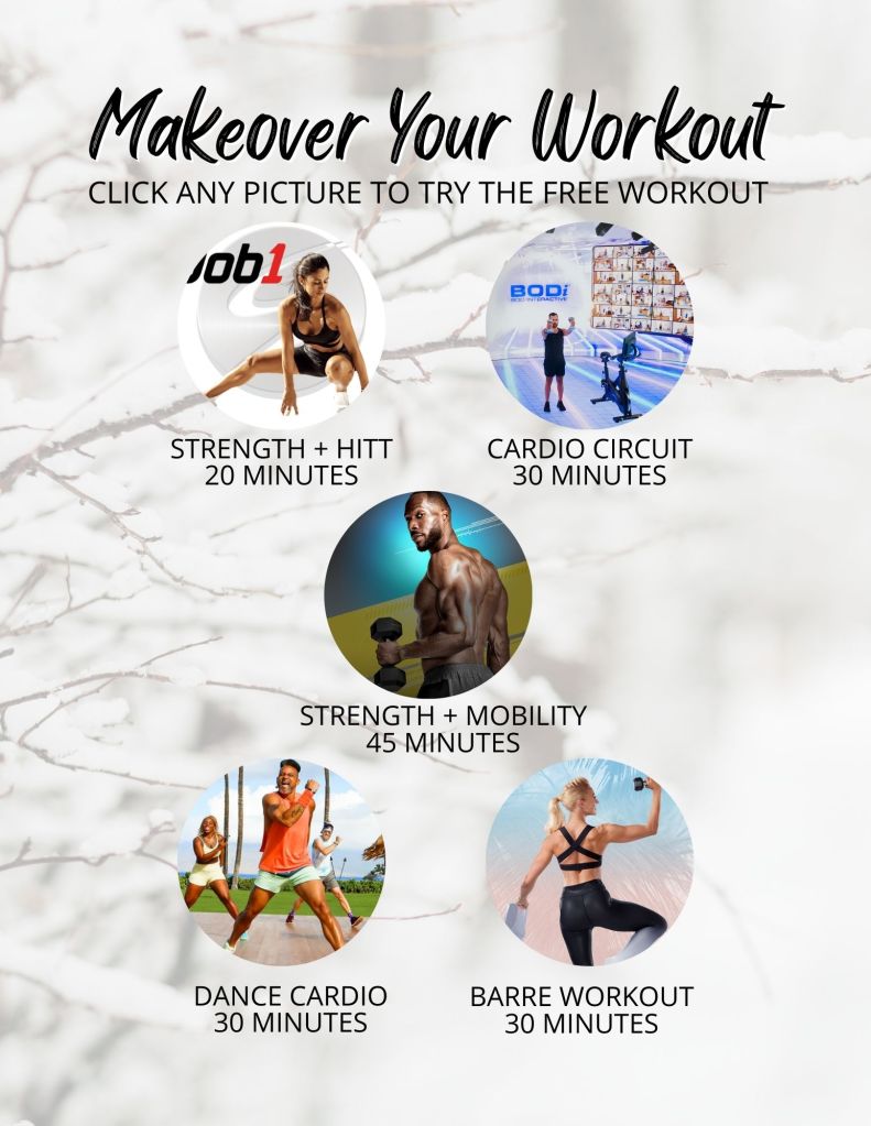 The best part about my virtual workout experience is that no matter where I am I have access to resources that support my health + fitness. Over the holidays, long weekend trips, visiting friends, my gym is only a click away! The program I am doing now is only 20 minutes a day; does it get any more convenient than that? If you find yourself skipping more workouts or already slipping behind on your 2022 goals, I invite you to give the virtual world of fitness a try! Here is a free week of workouts for you to makeover your week. (The first one is from that 20-minute program I am doing. If you love it like me, let me know so we can do it together!) Try them all and let me know your favorite!