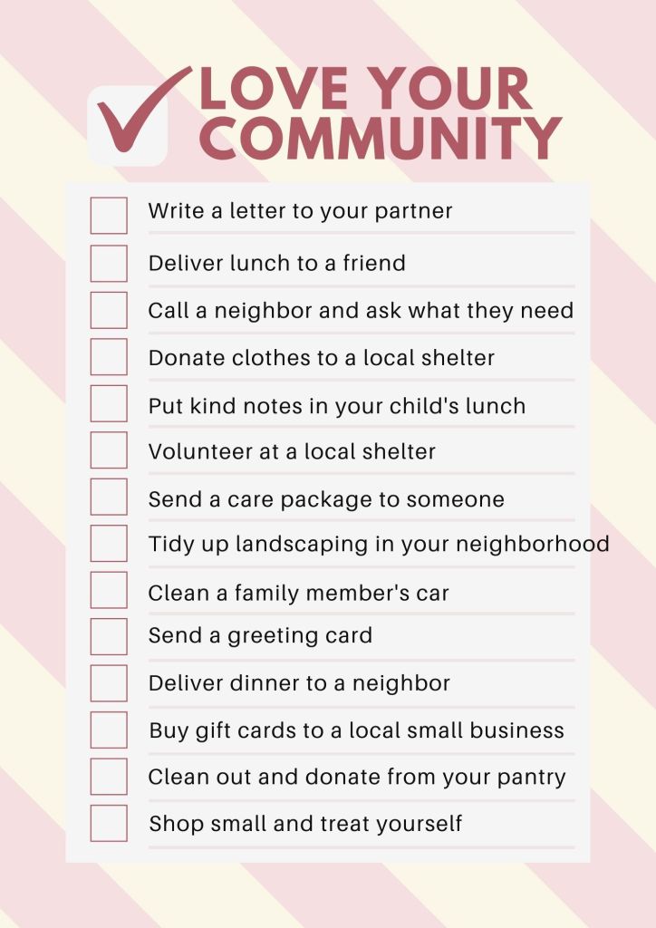 So this week, let’s love our community! Here are 14 ways to show love to the people around you. Use this free PDF to track your kind acts and reflect on how it feels to give your best love to others. Feel free to share the tracker with me so I can celebrate with you!