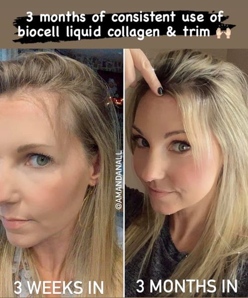 Thank goodness for liquid collagen…it has been everything I’d hoped it would be and more!! I started noticing new hair growth around 3 weeks into taking Biocell and Trim. (I have used both Life and Skin). I’m so happy with the hair that’s coming in!! My skin looks better than ever too, I’ve got actual muscle definition in my abs again and I’m just a true believer.